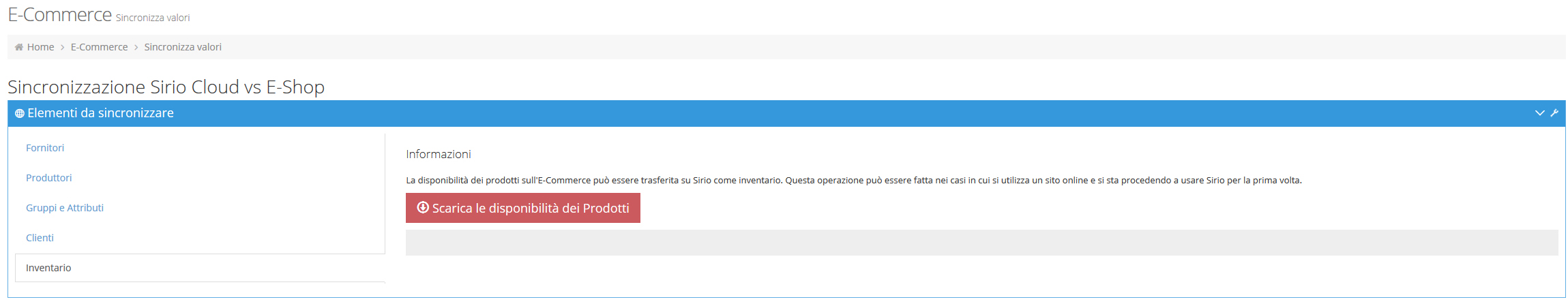 La disponibilità dei prodotti sull’E-Commerce può essere trasferita su Sirio come inventario. Questa operazione può essere fatta nei casi in cui si utilizza un sito online e si sta procedendo a usare Sirio per la prima volta.
