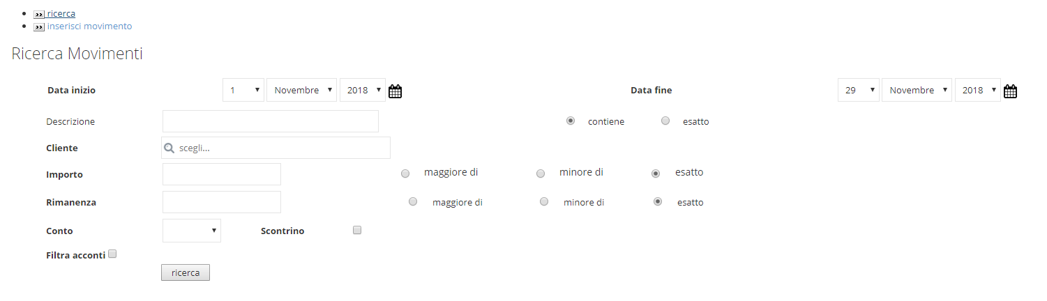 - Filtra acconti: è possibile effettuare una ricerca di pagamenti oltre che di movimenti. Indicare: